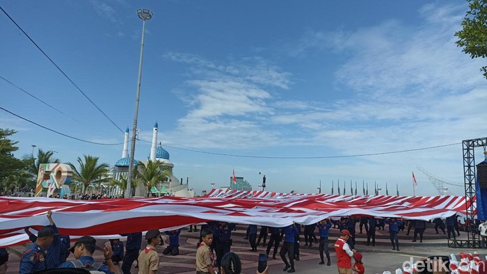 Makassar – Sebanyak 77 bendera merah putih dengan total panjang 5.000 meter dibentangkan di anjungan Pantai Losari. Pembentangan bendera ini sebagai rangkaian peringatan HUT RI ke-77 yang dilaksanakan Pemerintah Kota Makassar.