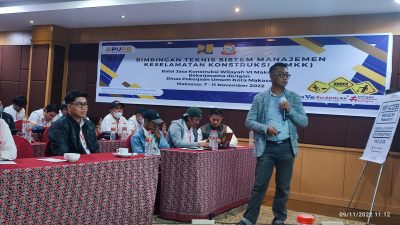 Agar kontraktor, konsultan dan staf paham akan aturan baru Permen PU Nomor 10 tahun 2021 , Dinas Pekerjaan Umum (DPU) Kota Makassar menggelar Bimtek Sistem Manajemen dan Keselamatan Konstruksi di Hotel Swiss Bellin Jl. Boulevard Kota Makassar selama 4 hari dimulai senin hingga jumat tanggal 7 – 11 November 2022