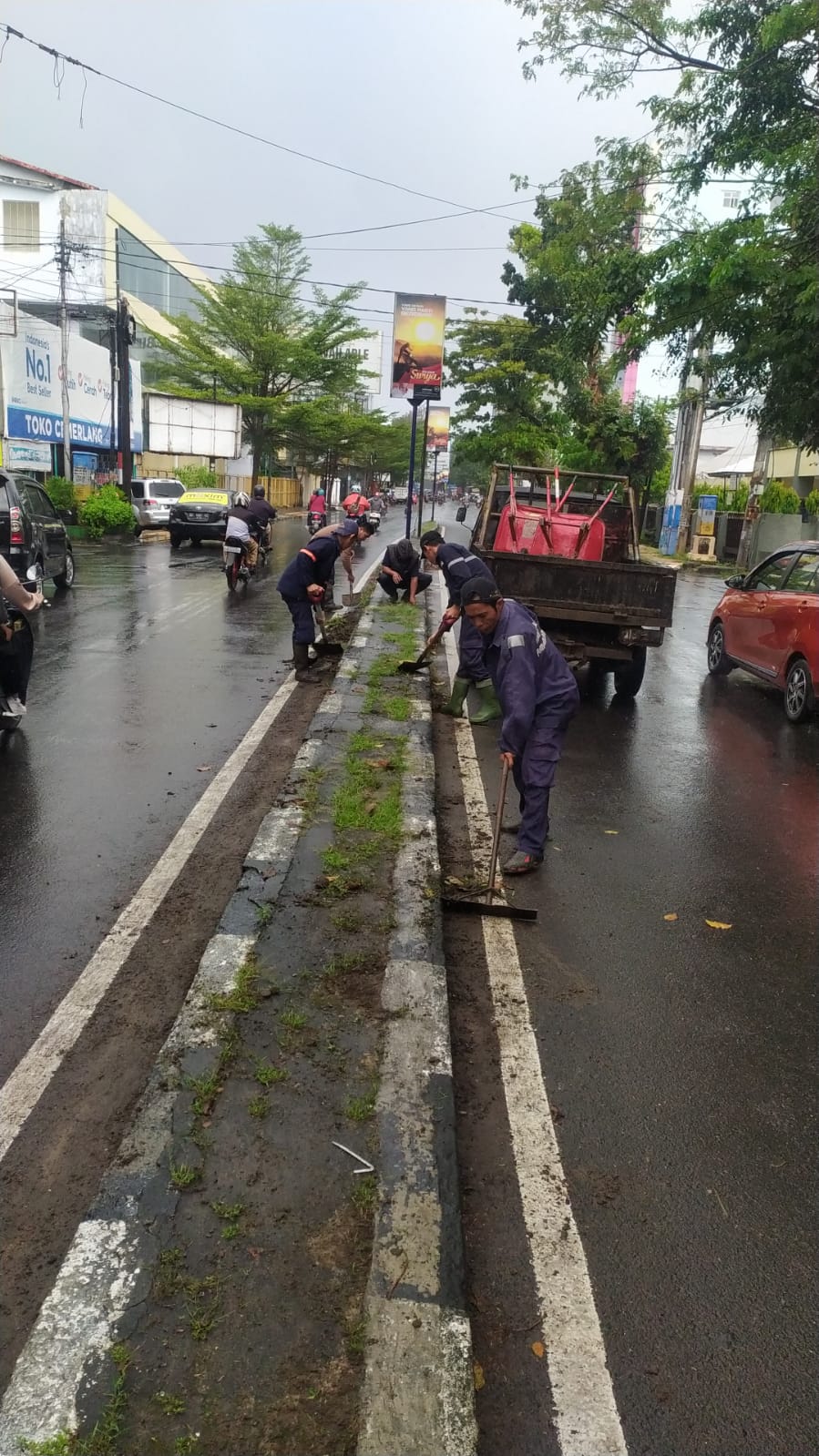 Dengan menggunakan alat sederhana seperti skop dan linggis para petuas membersihkan rumput liar, menormalkan tali air dan lubang nya yg tersumbat tanah, dan sapu untuk membersihkan sampah yg terdapat di median jalan dan sekitarnya.