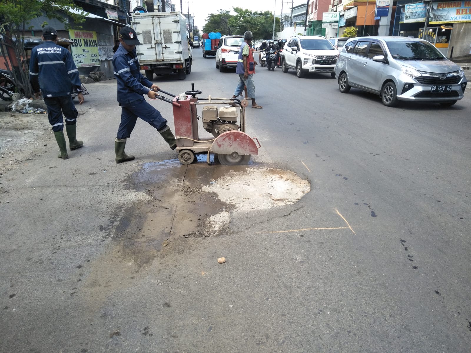 Makassar,- Tak terdampak aksi unjuk rasa mahasiswa, satgas sapulubang bidang jalan dan jembatan dinas PU kota Makassar tetap beraksi. Atas laporan warga dengan sigap melakukan penutupan lubang jalan yang terdapat di Jl. Adiyaksa Makassar, Senin 11 April 2022. Dengan menurunkan 10 tenaga satgas jalan, melakukan penutupan  dengan paving blok. Alat cutting digunakan untuk menyesuaikan lubang agar paving blok dapat menutup lubang dengan maksimal.  “Ini instruksi langsung dari ibu kadis, setelah ada laporan warga”, ucap A. Asham penanggung jawab pemeliharaan jalan